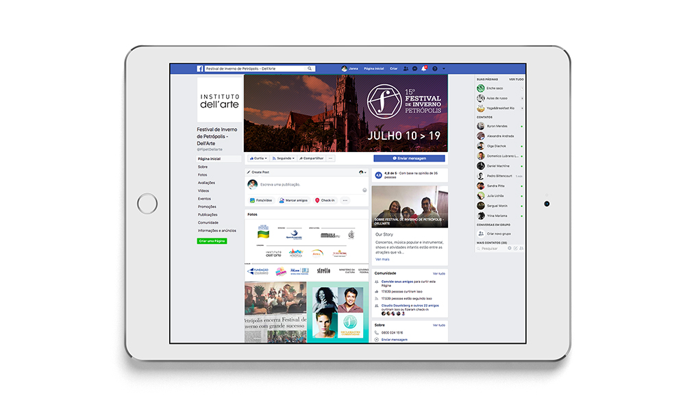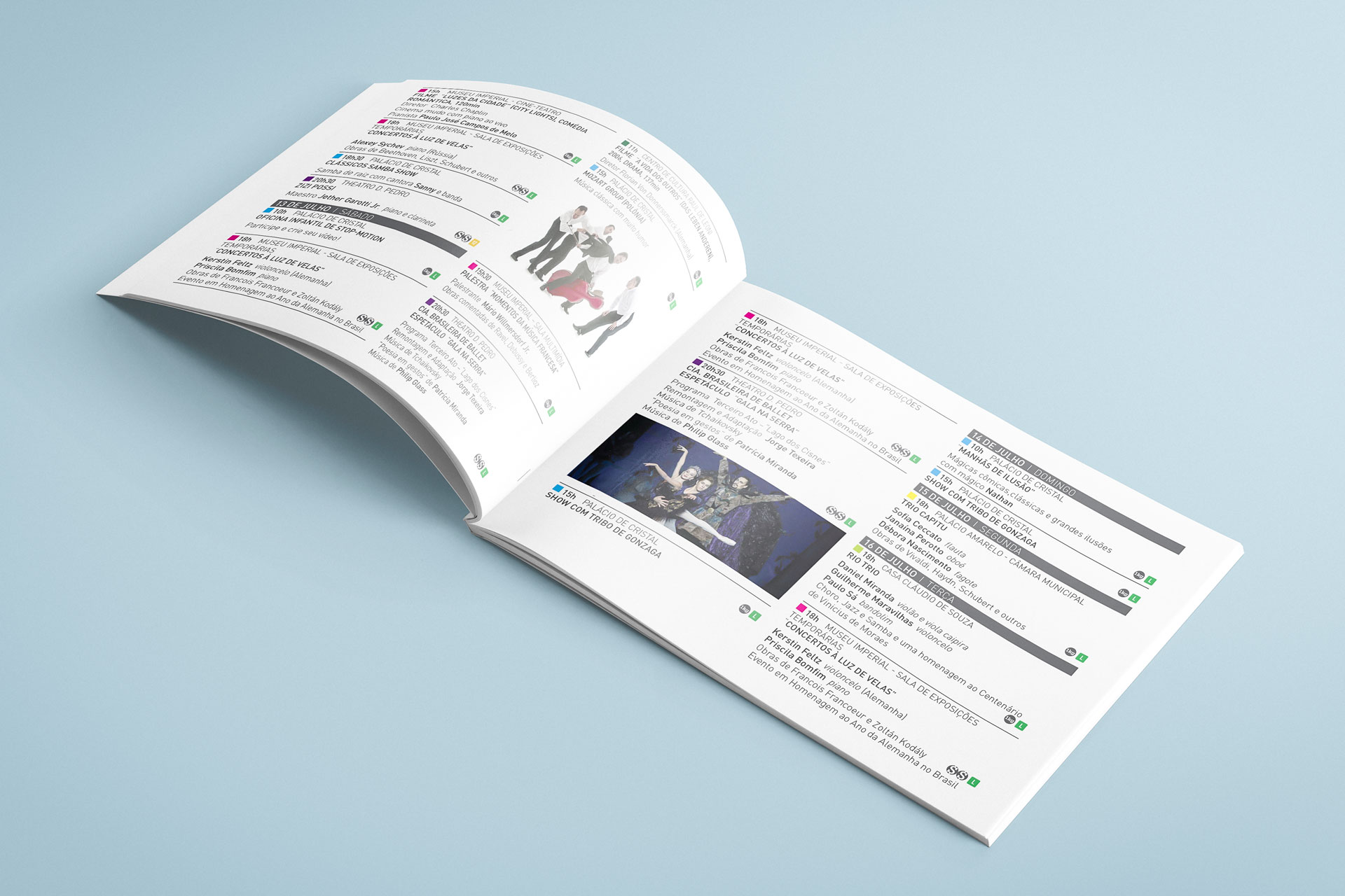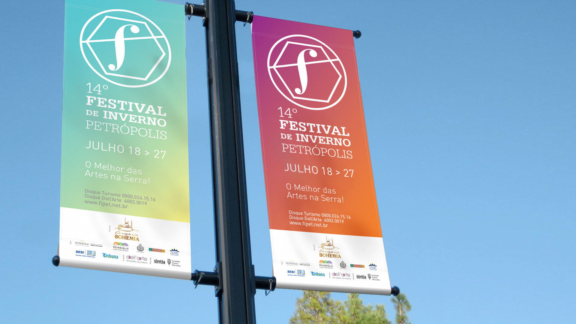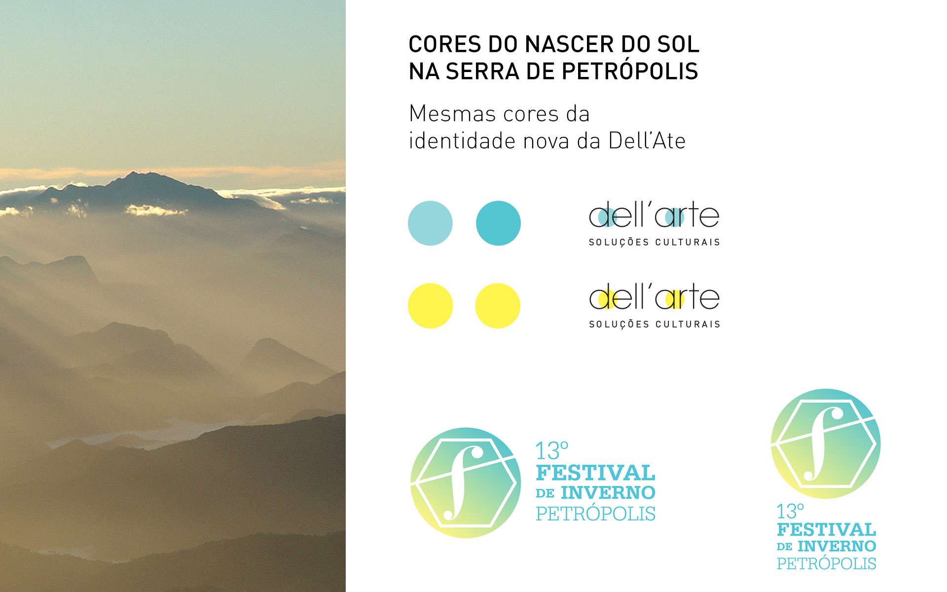 Em 2013, tive a oportunidade de modernizar a tradicional marca do festival do final dos anos 90. A solução foi criar um símbolo forte que passasse o virtuosismo, movimento e excelência presentes no festival. A inspiração para as cores utilizadas na marca foi a cor do céu ao nascer e pôr do sol da descida da serra de Petrópolis.